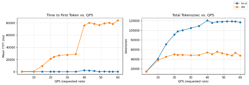 - Result: 4.5-11k output tokens/sec throughput, P50 TTFT 136–157ms, up to 109% higher throughput and 99% lower TTFT vs baseline Kubernetes service